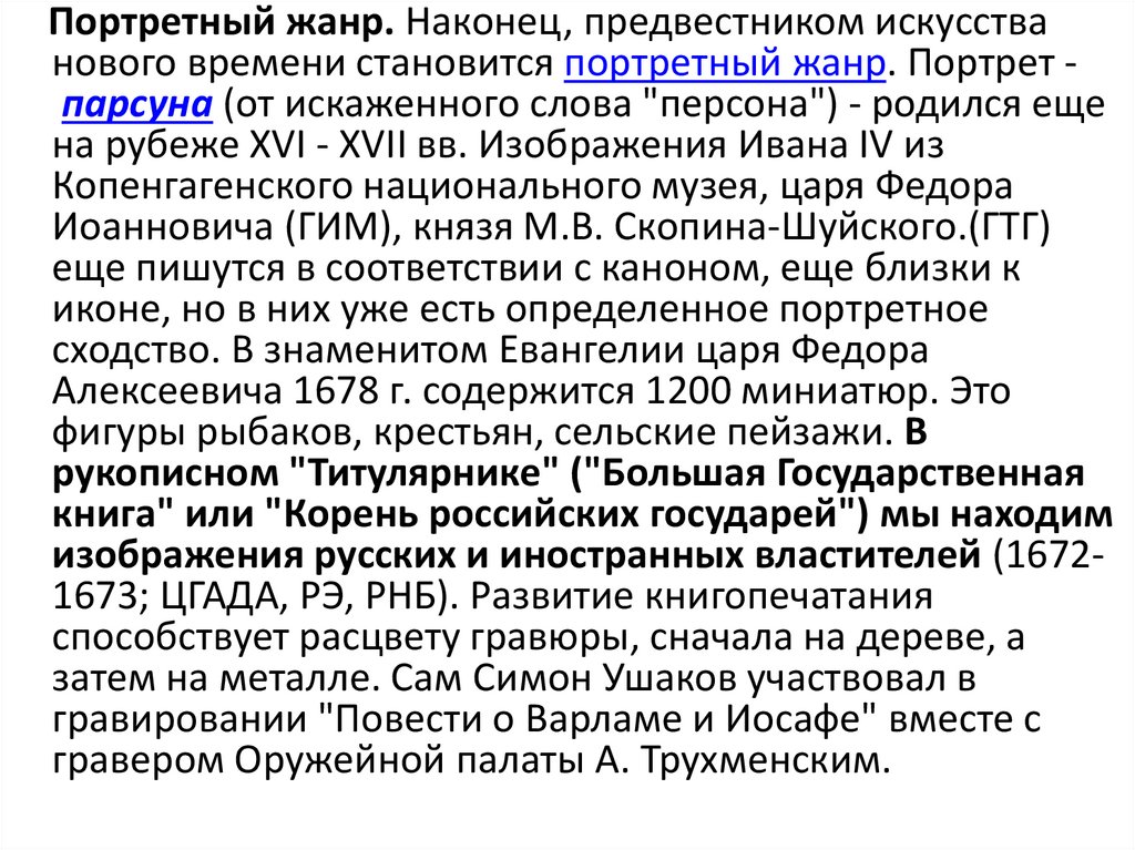 Портретный жанр. Наконец, предвестником искусстванового времени становится портретный жанр. Портрет парсуна (от искаженного слова "персона") - родился еще