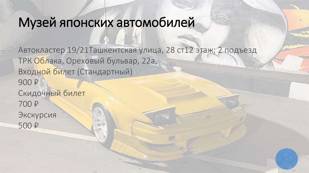Музей японских автомобилейАвтокластер 19/21Ташкентская улица, 28 ст12 этаж; 2 подъезд