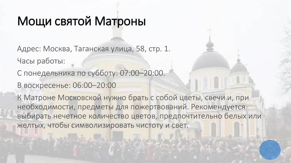 Мощи святой МатроныАдрес: Москва, Таганская улица, 58, стр. 1.