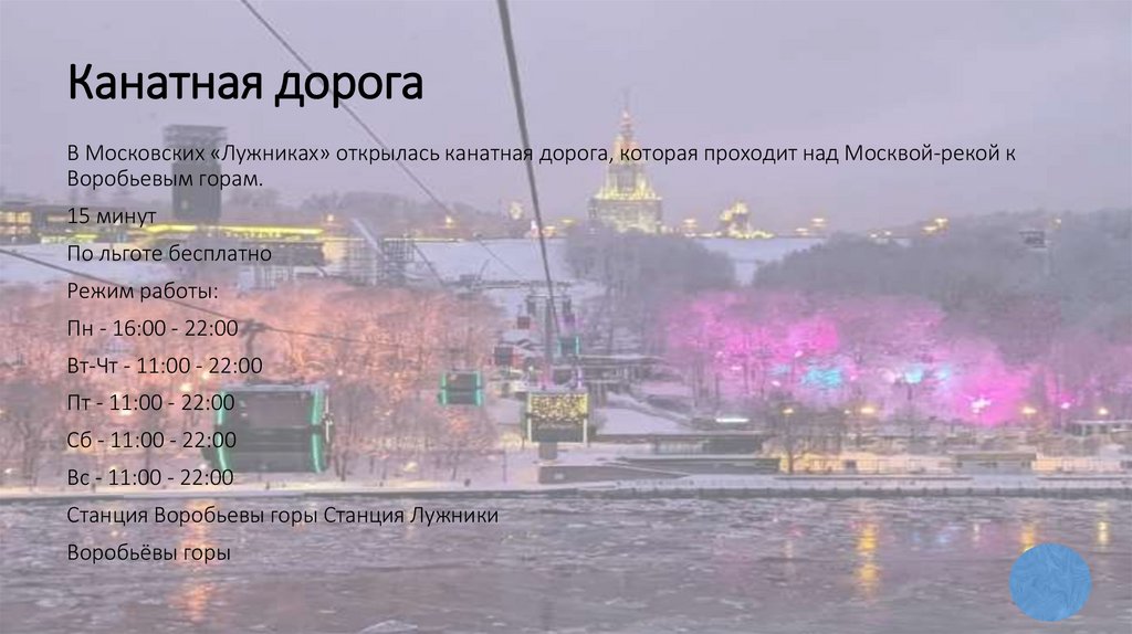 Канатная дорогаВ Московских «Лужниках» открылась канатная дорога, которая проходит над Москвой-рекой к