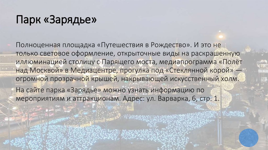 Парк «Зарядье»Полноценная площадка «Путешествия в Рождество». И это не