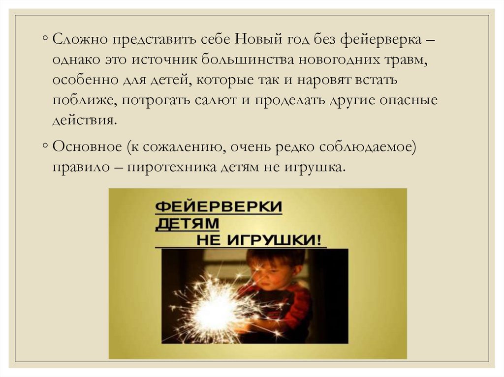 ◦ Сложно представить себе Новый год без фейерверка –однако это источник большинства новогодних травм,