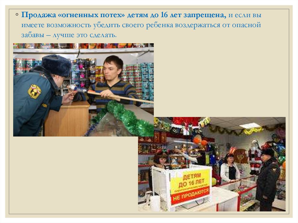 ◦ Продажа «огненных потех» детям до 16 лет запрещена, и если выимеете возможность убедить своего ребенка воздержаться от опасной