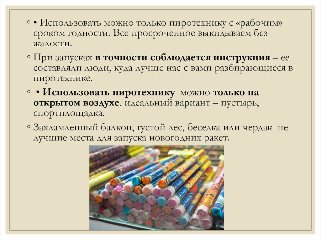 ◦ • Использовать можно только пиротехнику с «рабочим»сроком годности. Все просроченное выкидываем без