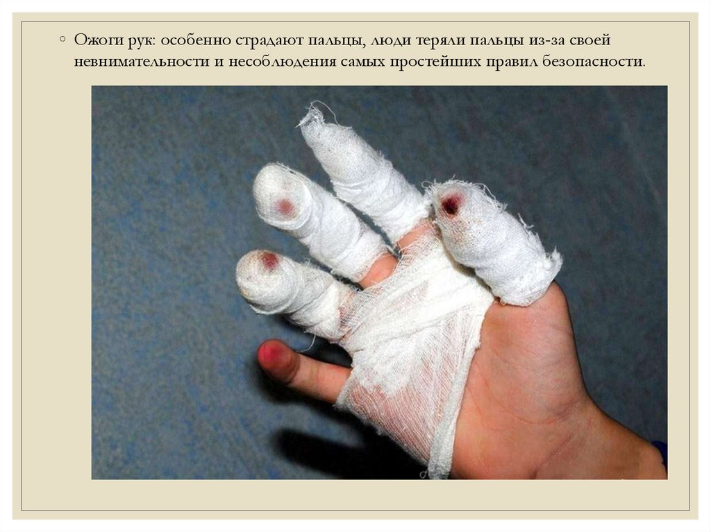 ◦ Ожоги рук: особенно страдают пальцы, люди теряли пальцы из-за своейневнимательности и несоблюдения самых простейших правил безопасности.