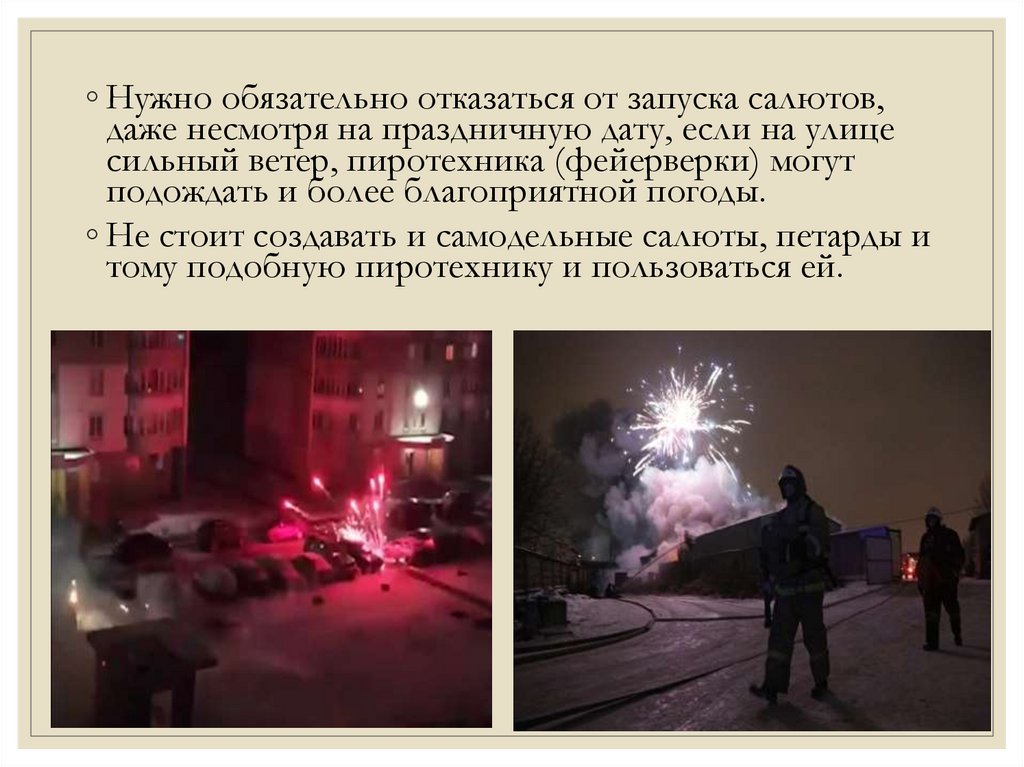 ◦ Нужно обязательно отказаться от запуска салютов,даже несмотря на праздничную дату, если на улице