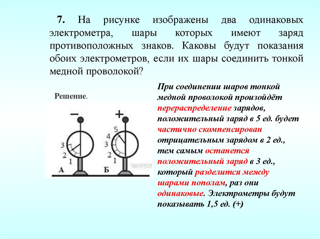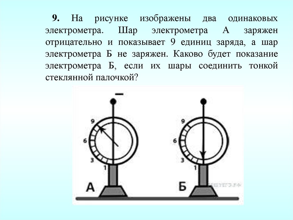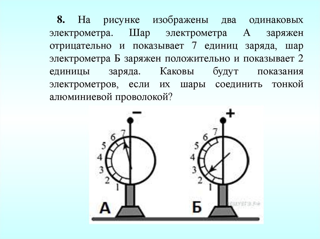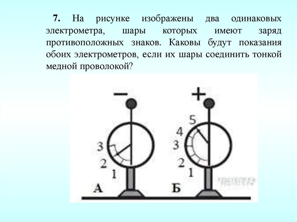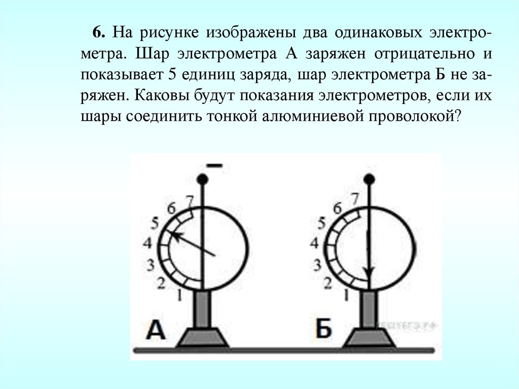 6. На рисунке изображены два одинаковых электрометра. Шар электрометра А заряжен отрицательно ипоказывает 5 единиц заряда, шар электрометра Б не заряжен. Каковы будут показания электрометров, если их