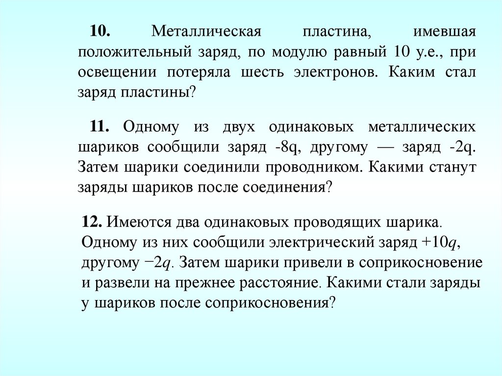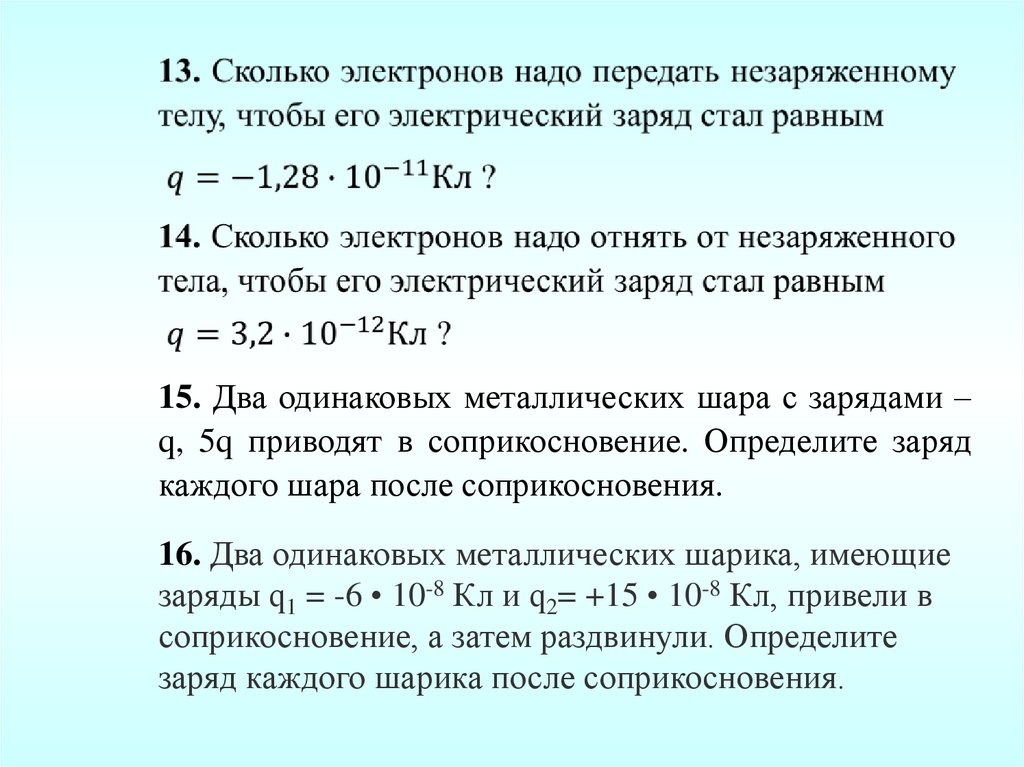 15. Два одинаковых металлических шара с зарядами –q, 5q приводят в соприкосновение. Определите заряд