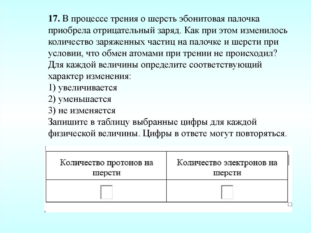 17. В процессе трения о шерсть эбонитовая палочкаприобрела отрицательный заряд. Как при этом изменилось