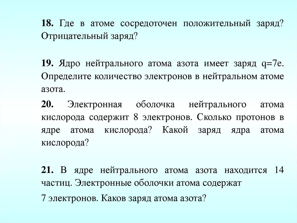 18. Где в атоме сосредоточен положительный заряд?Отрицательный заряд?