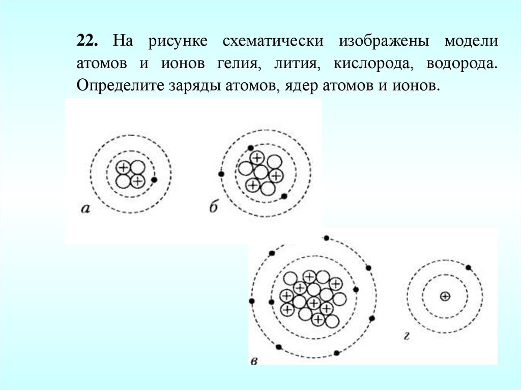 22. На рисунке схематически изображены моделиатомов и ионов гелия, лития, кислорода, водорода.