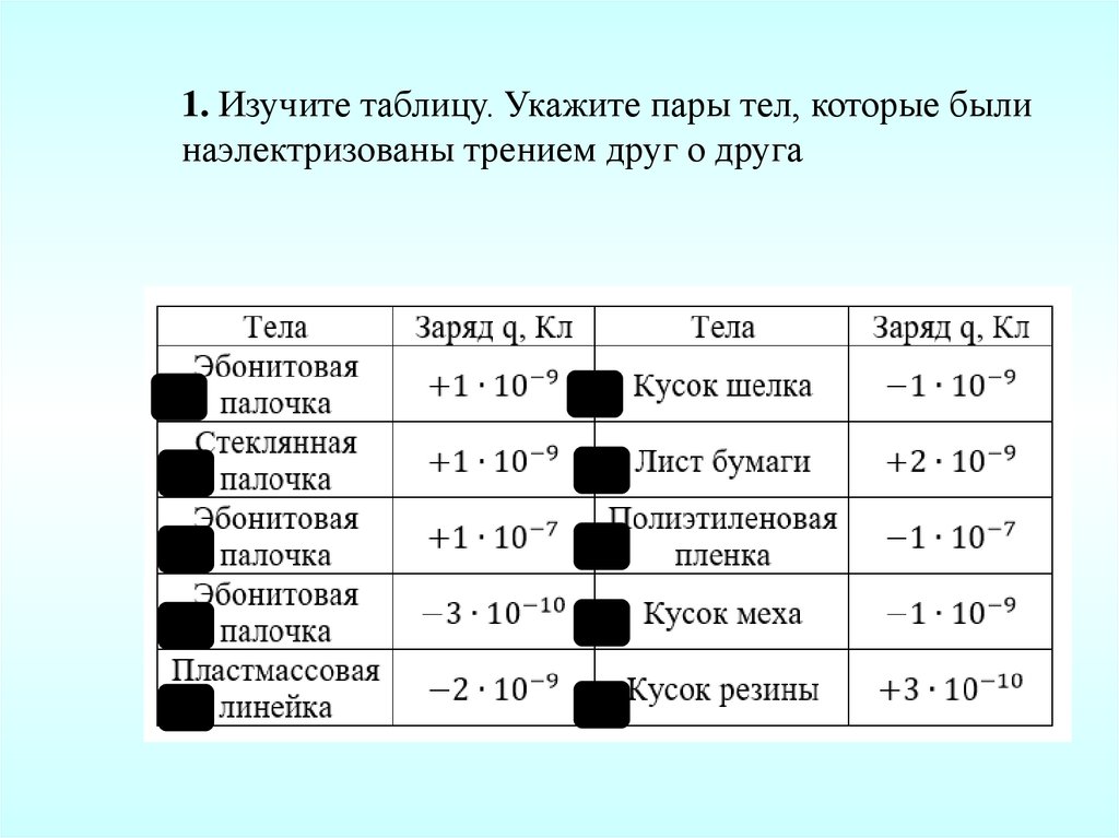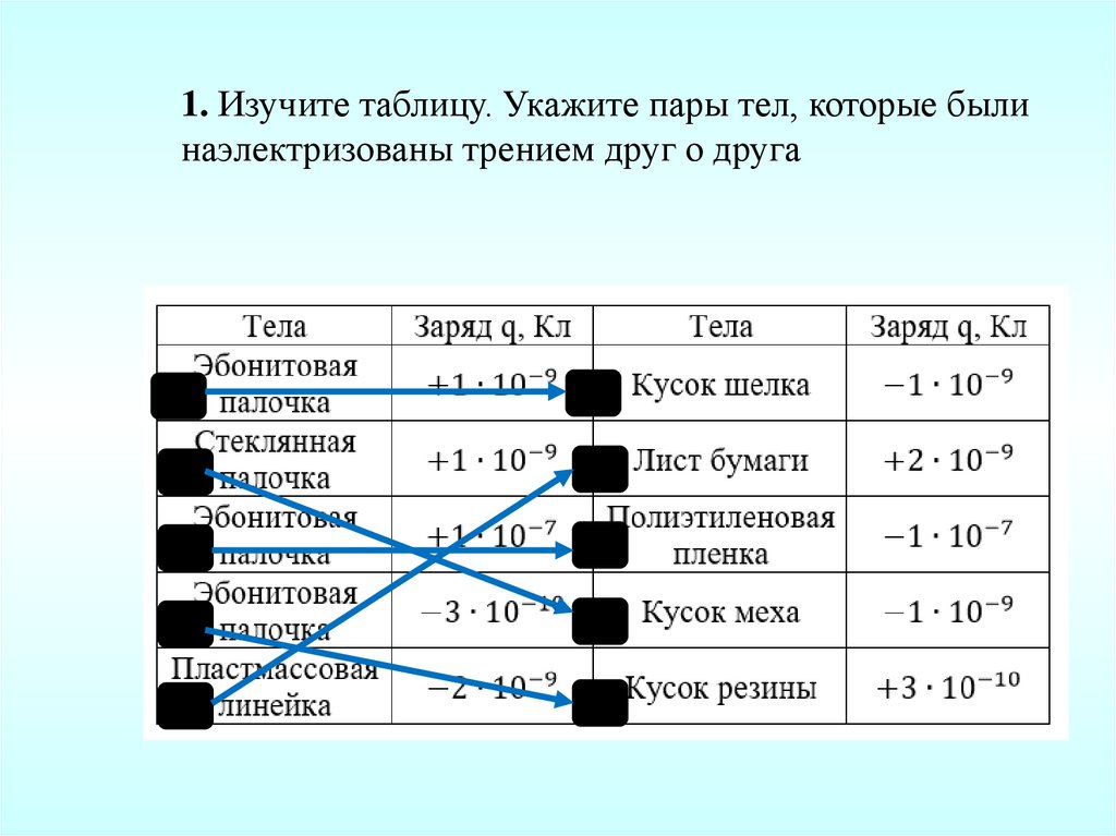 1. Изучите таблицу. Укажите пары тел, которые былинаэлектризованы трением друг о друга