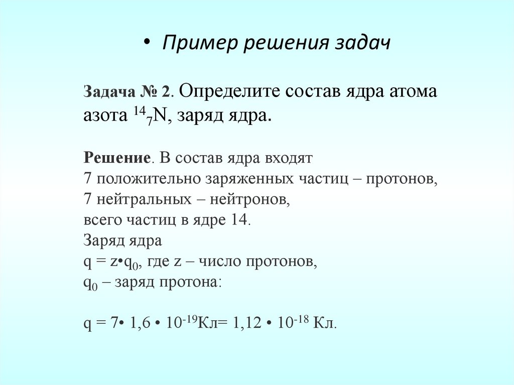 • Пример решения задачЗадача № 2. Определите состав ядра атома