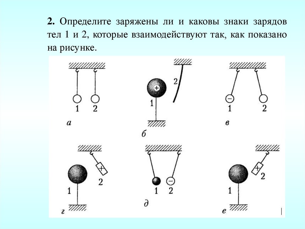 2. Определите заряжены ли и каковы знаки зарядовтел 1 и 2, которые взаимодействуют так, как показано