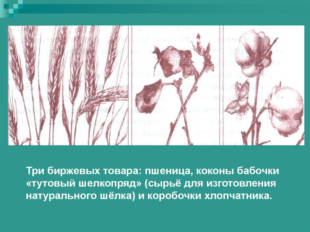 Три биржевых товара: пшеница, коконы бабочки«тутовый шелкопряд» (сырьё для изготовления