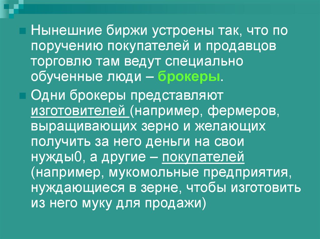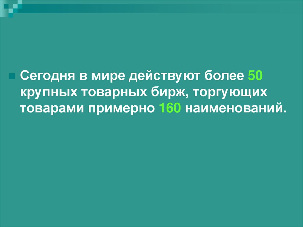 Сегодня в мире действуют более 50крупных товарных бирж, торгующих