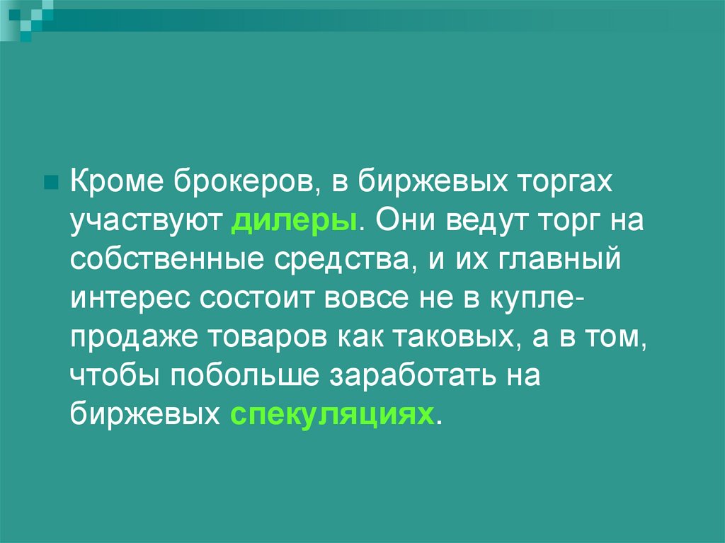 Кроме брокеров, в биржевых торгахучаствуют дилеры. Они ведут торг на