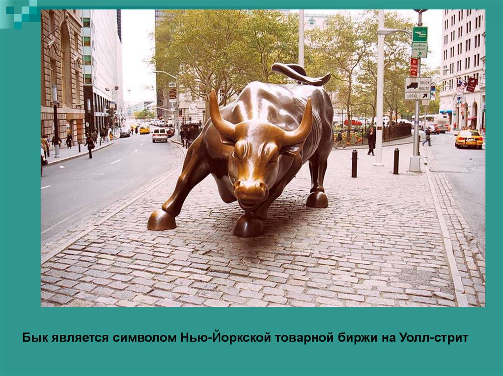 Бык является символом Нью-Йоркской товарной биржи на Уолл-стрит25. На Нью-Йоркской товарной бирже