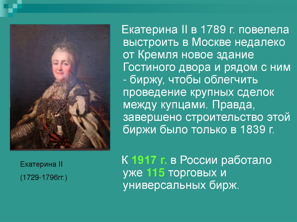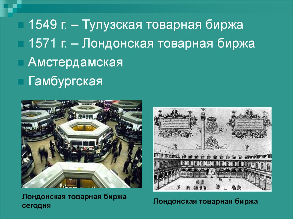 1549 г. – Тулузская товарная биржа1571 г. – Лондонская товарная биржа