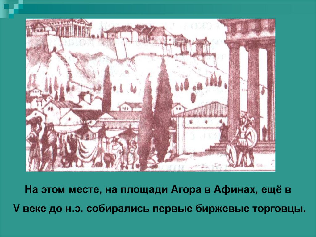 На этом месте, на площади Агора в Афинах, ещё вV веке до н.э. собирались первые биржевые торговцы.