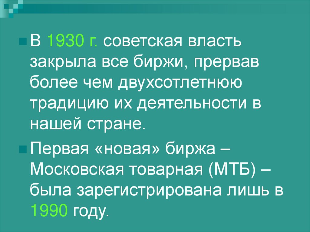 В 1930 г. советская властьзакрыла все биржи, прервав