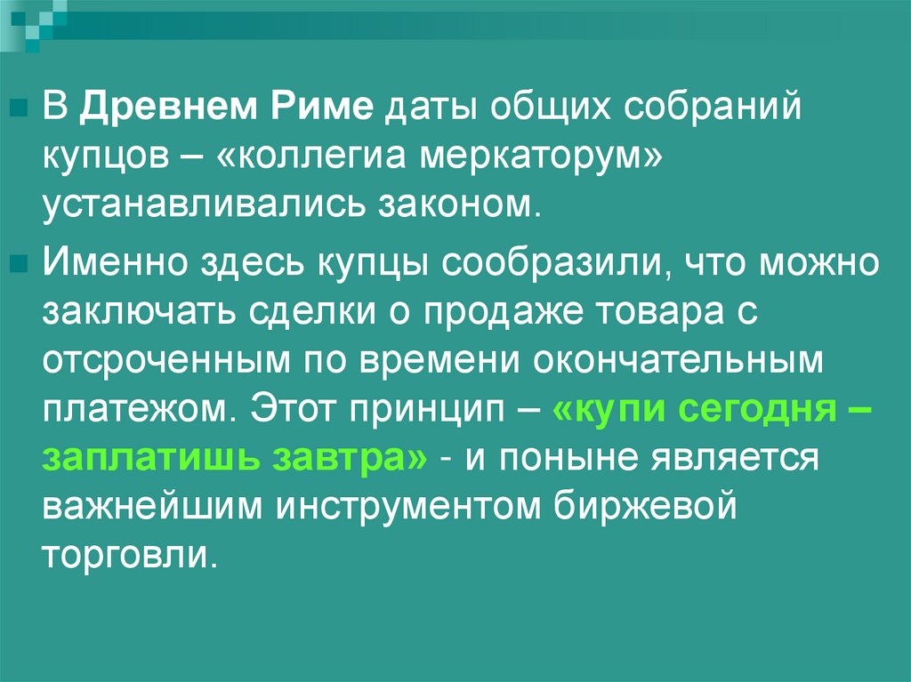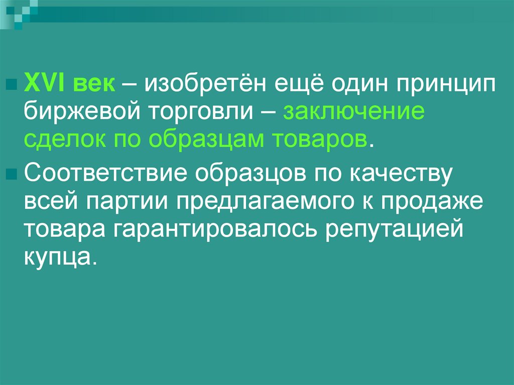 XVI век – изобретён ещё один принципбиржевой торговли – заключение