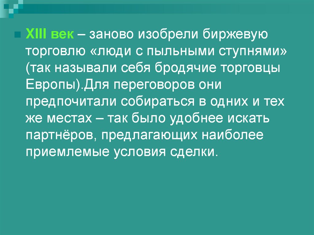 XIII век – заново изобрели биржевуюторговлю «люди с пыльными ступнями»