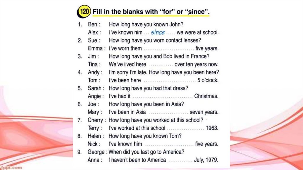 13. Вставьте предлог for или since. Предлог for указывает на весь промежуток времени, в то время как since лишь на начало.