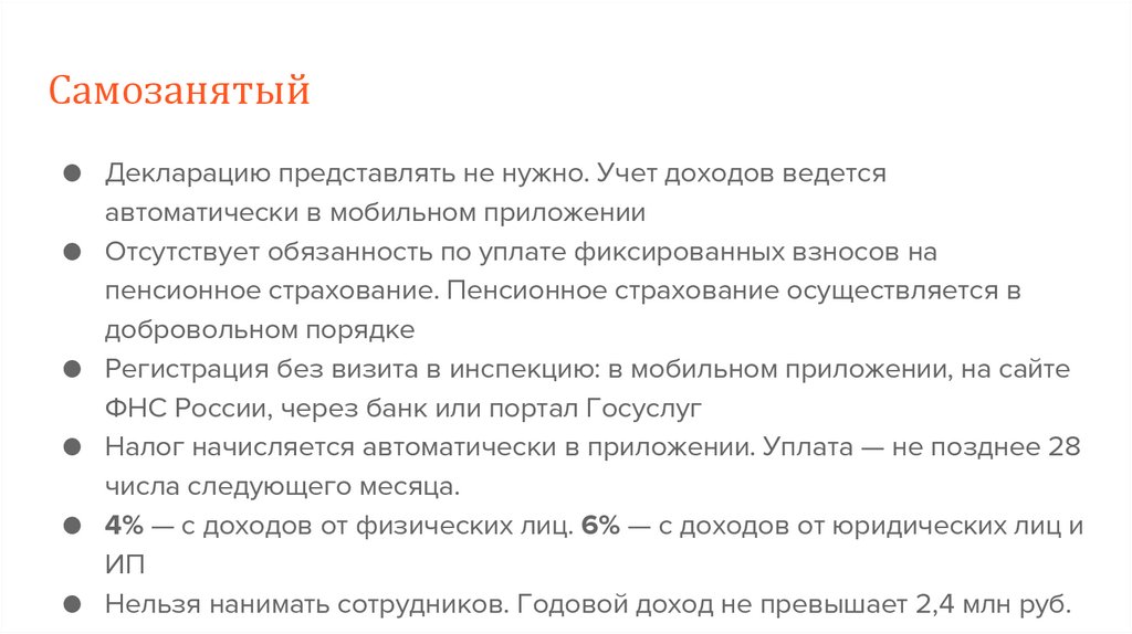 ● Нельзя нанимать сотрудников. Годовой доход не превышает 2,4 млн руб.