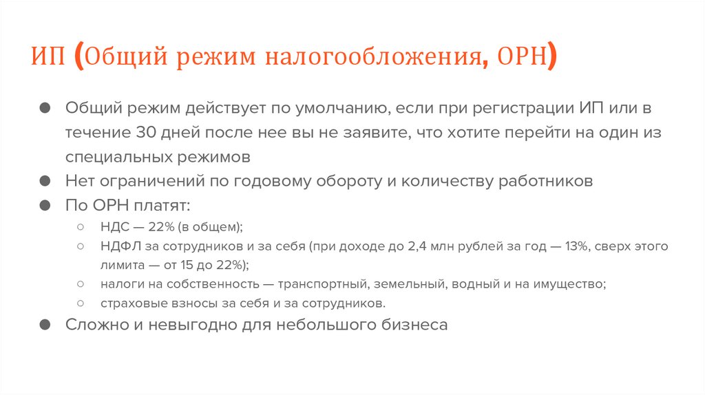 ИП (Общий режим налогообложения, ОРН)● Общий режим действует по умолчанию, если при регистрации ИП или в