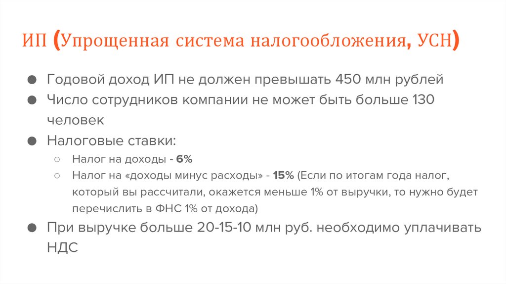 ИП (Упрощенная система налогообложения, УСН)● Годовой доход ИП не должен превышать 450 млн рублей
