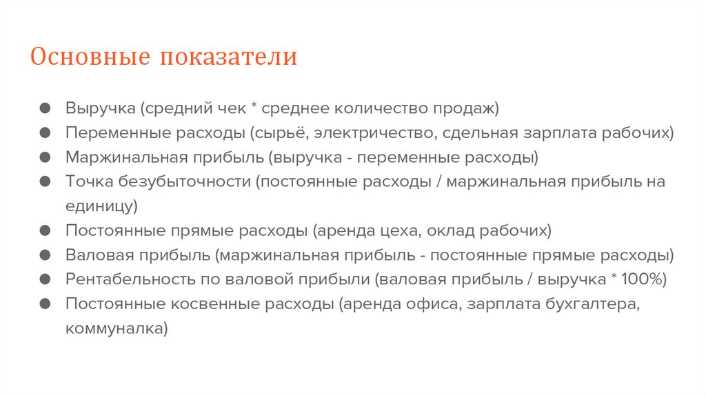 Основные показателиВыручка (средний чек * среднее количество продаж)