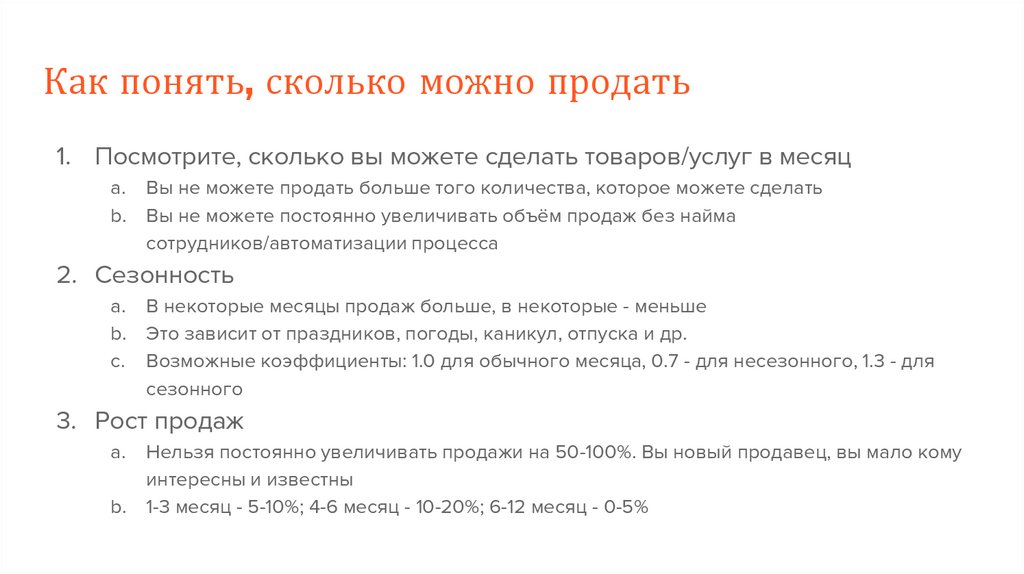 Как понять, сколько можно продать1. Посмотрите, сколько вы можете сделать товаров/услуг в месяц