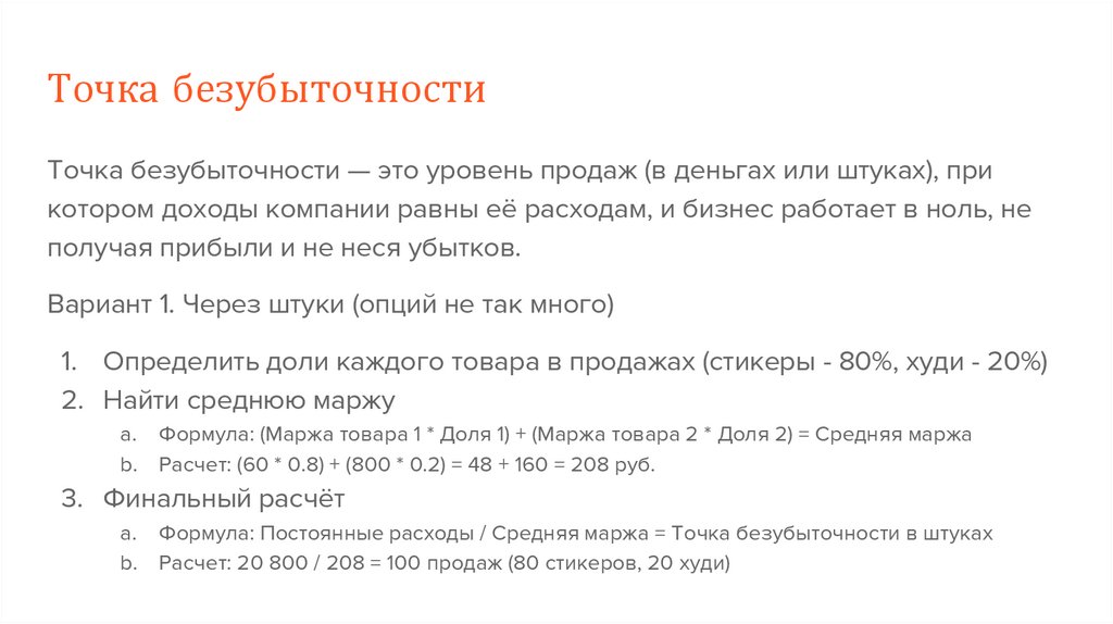 котором доходы компании равны её расходам, и бизнес работает в ноль, не