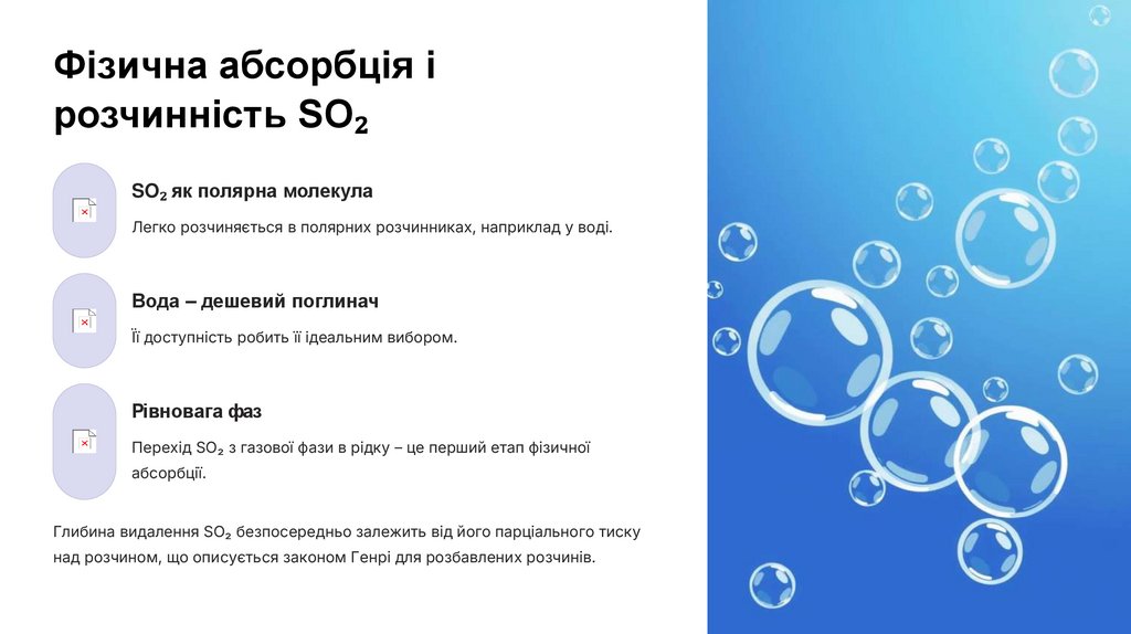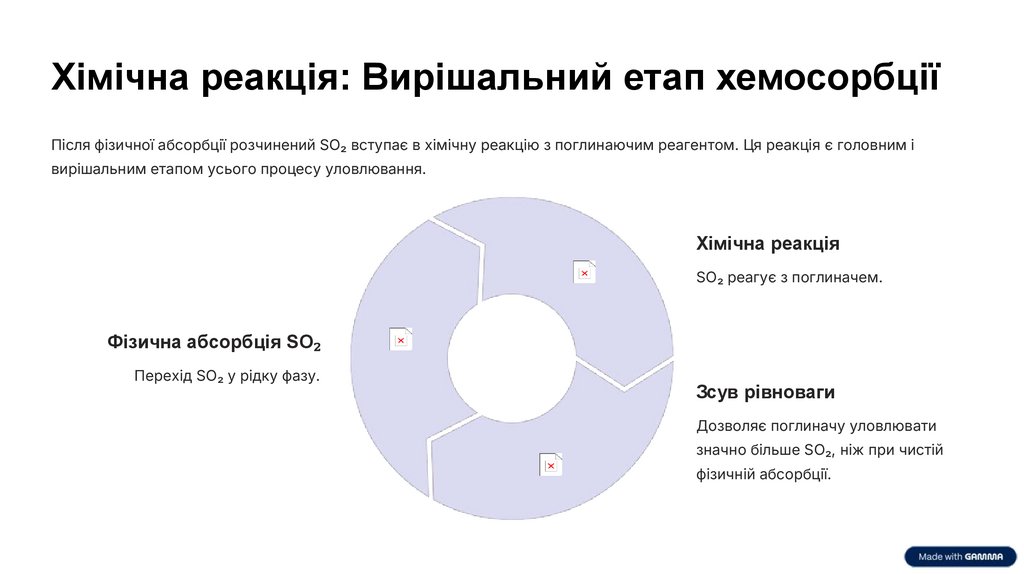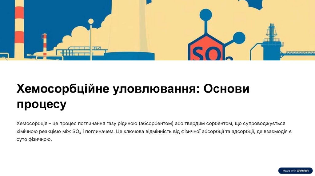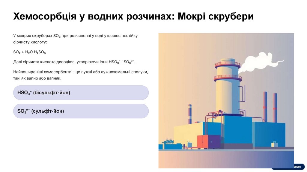 хімічною реакцією між SO₂ і поглиначем. Це ключова відмінність від фізичної абсорбції та адсорбції, де взаємодія є