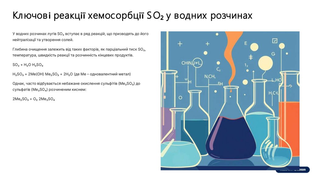 Кл ючов і реакції хемосорбції S O₂ у водних розчинахУ водних розчинах лугів SO₂ вступає в ряд реакцій, що призводять до його
