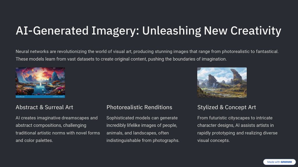 AI-Generated Imagery: Unleashing New CreativityNeural networks are revolutionizing the world of visual art, producing stunning images that range from photorealistic to fantastical.