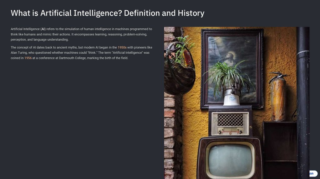 What is Artificial Intelligence? Definition and HistoryArtificial Intelligence (AI) refers to the simulation of human intelligence in machines programmed to