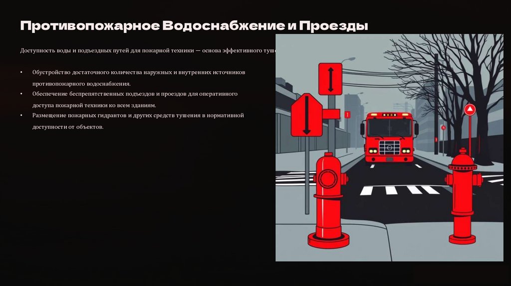 Противопожарное Водоснабжение и ПроездыДоступность воды и подъездных путей для пожарной техники — основа эффективного тушения.