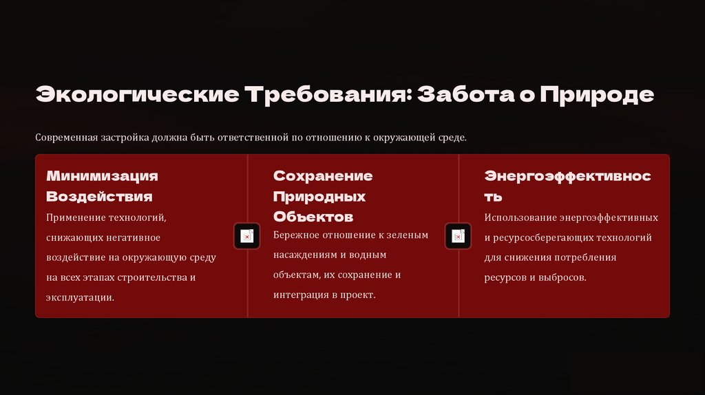 Экологические Требования: Забота о ПриродеСовременная застройка должна быть ответственной по отношению к окружающей среде.