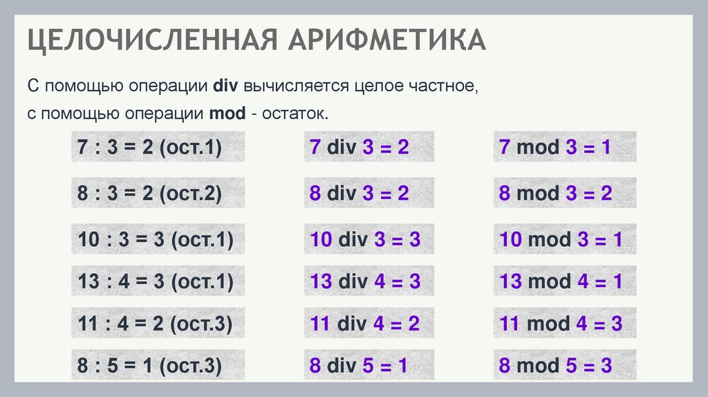 ЦЕЛОЧИСЛЕННАЯ АРИФМЕТИКАС помощью операции div вычисляется целое частное,