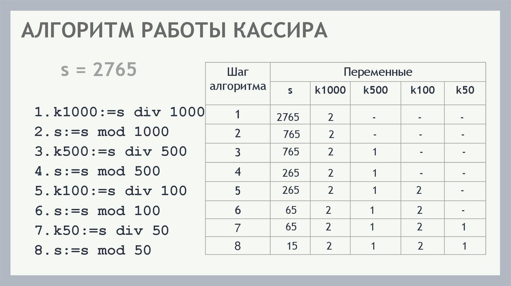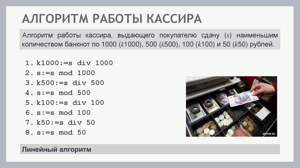АЛГОРИТМ РАБОТЫ КАССИРААлгоритм работы кассира, выдающего покупателю сдачу (s) наименьшим