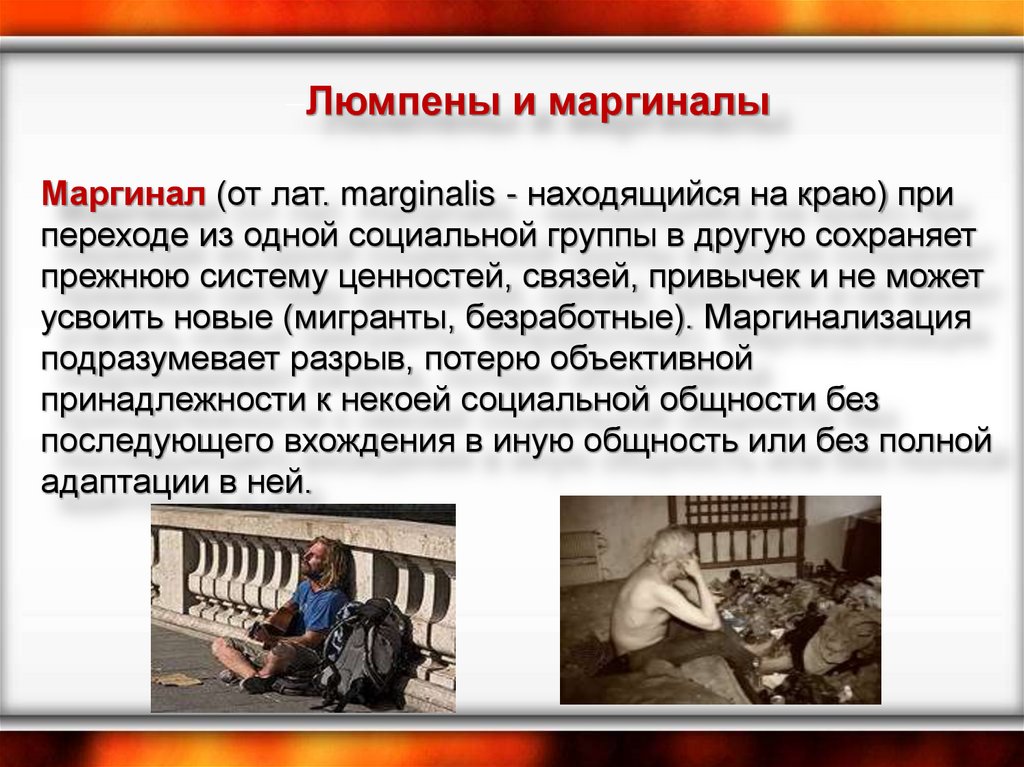 –Люмпены и маргиналыМаргинал (от лат. marginalis - находящийся на краю) при
