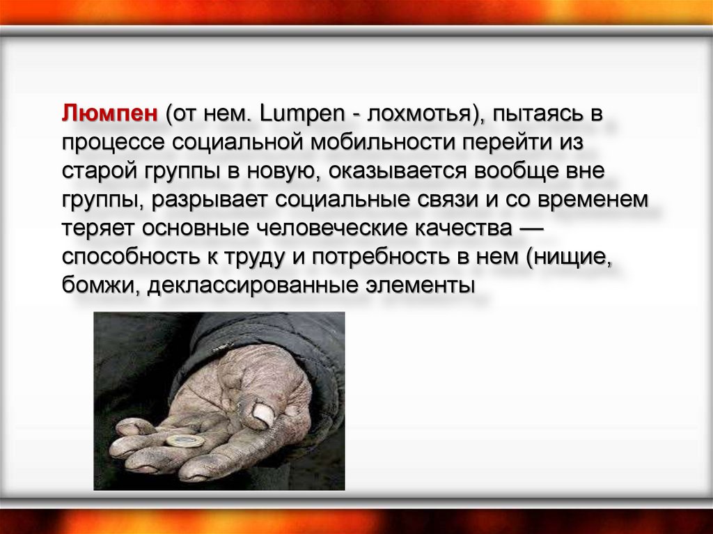 Люмпен (от нем. Lumpen - лохмотья), пытаясь впроцессе социальной мобильности перейти из