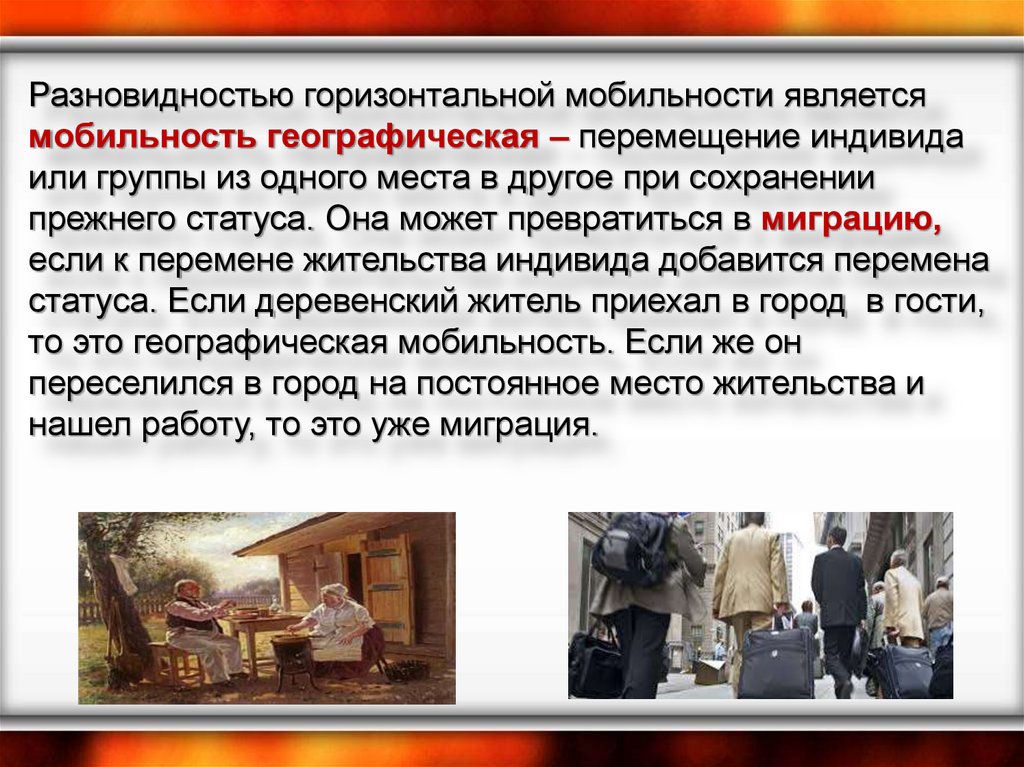 Разновидностью горизонтальной мобильности являетсямобильность географическая – перемещение индивида