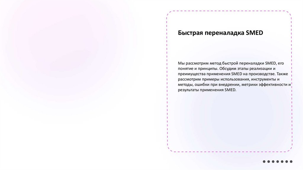 Быстрая переналадка SMEDМы рассмотрим метод быстрой переналадки SMED, его