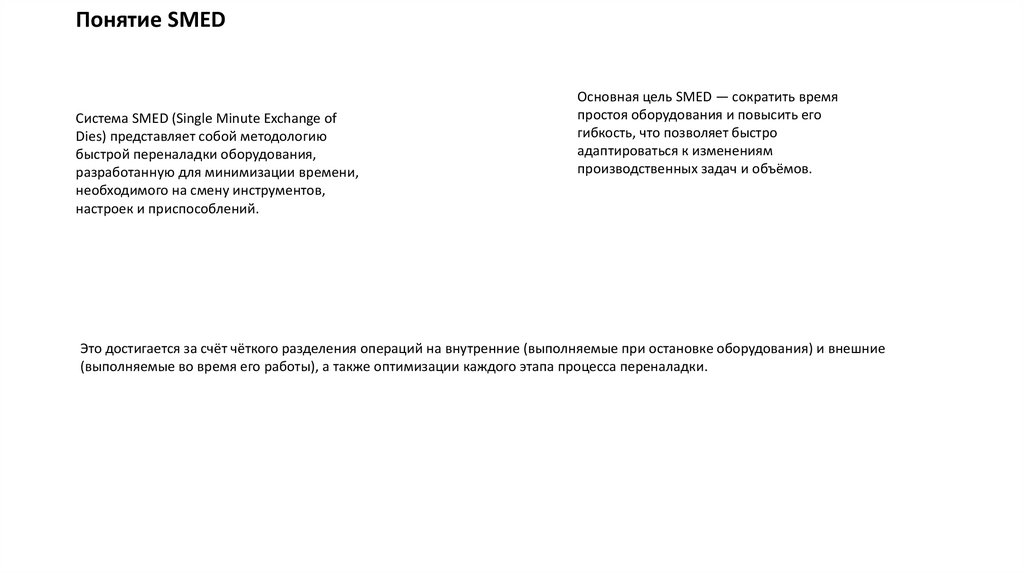 Принципы SMEDПринципы SMED включают в себя чёткое разделение внутренних и внешних операций