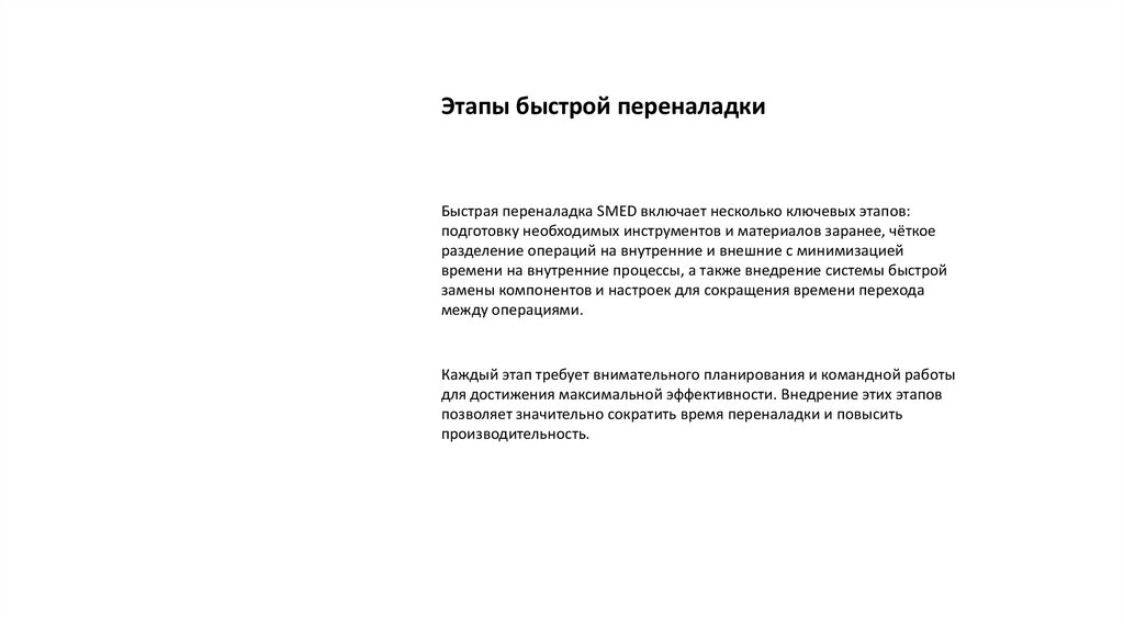 Этапы быстрой переналадкиБыстрая переналадка SMED включает несколько ключевых этапов: