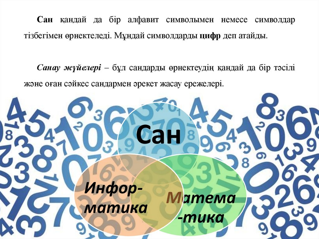 Сан қандай да бір алфавит символымен немесе символдартізбегімен өрнектеледі. Мұндай символдарды цифр деп атайды.