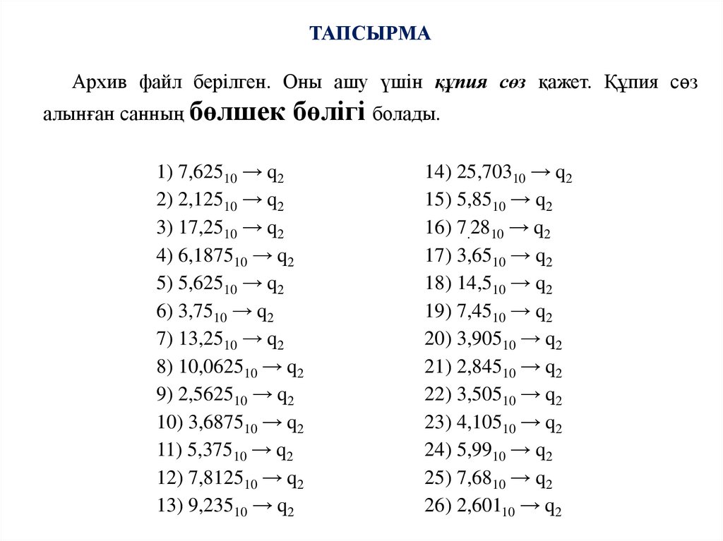ТАПСЫРМААрхив файл берілген. Оны ашу үшін құпия сөз қажет. Құпия сөз